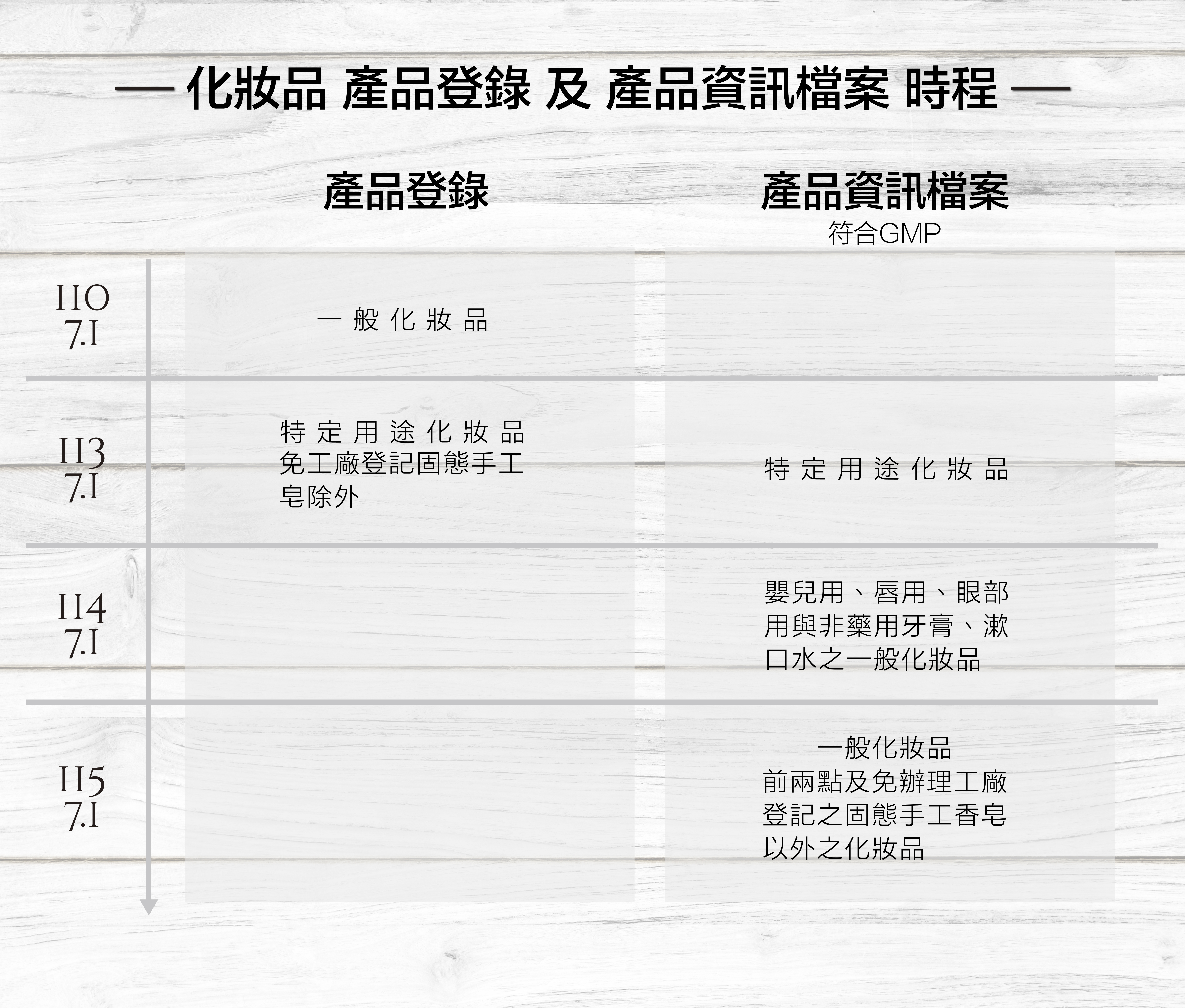 登錄內容:產品名稱、產品種類及用途、產品劑型、使用注意事項、製造或輸入業者資訊、製造場所資訊及其符合化妝品優良製造規範情形、產品全成分名稱與含量等。